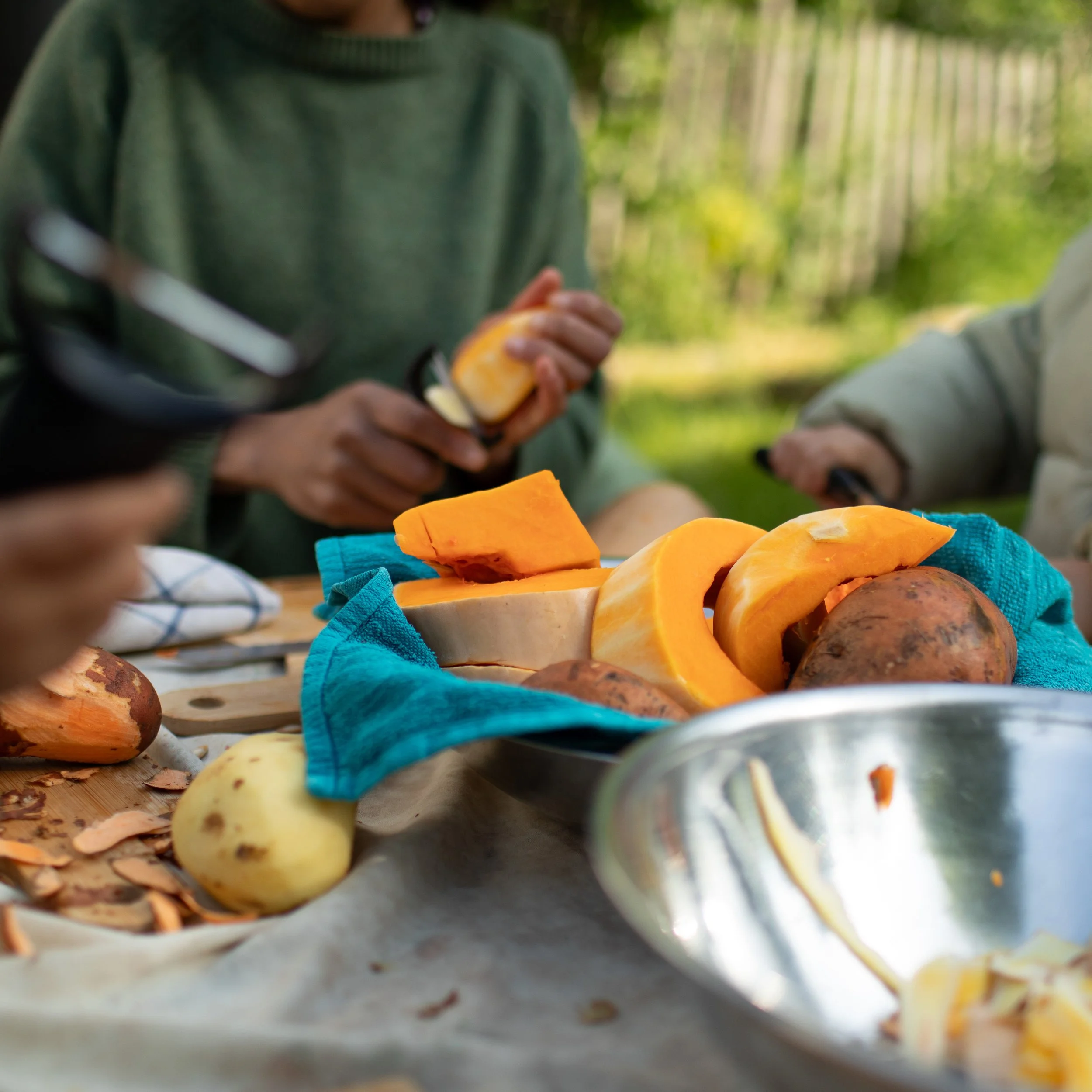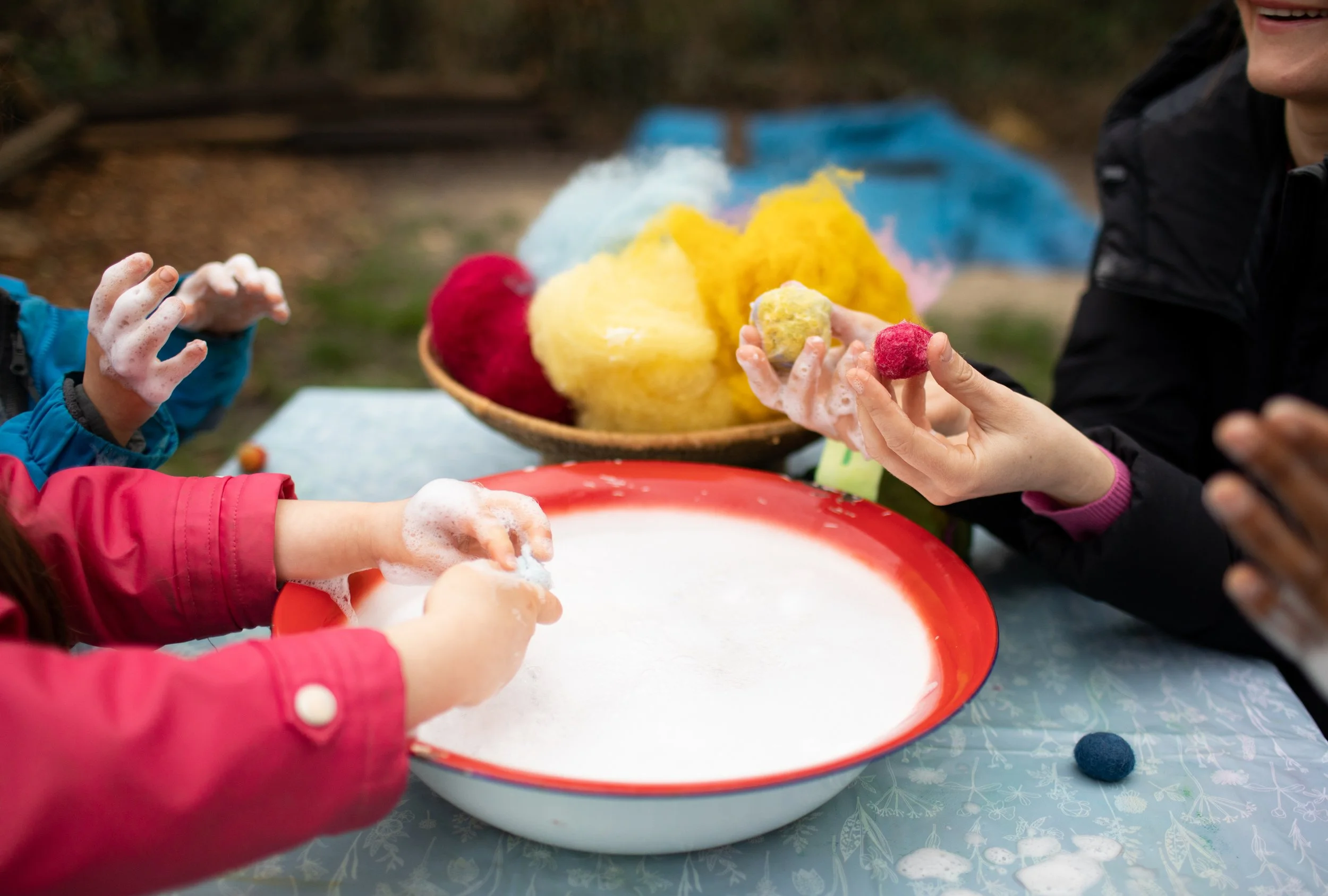 Around halfway through a session, we will wash hands and gather for a healthy shared snack (gluten-free, sugar-free and vegan apple crumble) and herb tea in the ‘barn’. There is then the opportunity for children to have a last outdoor play whilst we slowly tidy up the garden. Before the session ends, we gather on the grass area for a short ‘circle time’, which includes two or three age-appropriate seasonal songs/games in movement/verses and puppets. We end our time together with a goodbye song at the gate.
